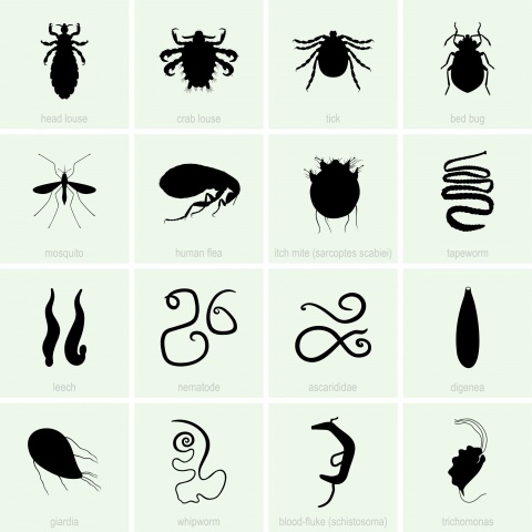 Illustration of a set of various types of parasitic organisms that are dependent on human bodies for nutrients. © barbulat