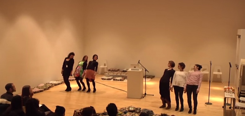For her contribution to the symposium, Kresge spoke briefly about how, from the perspective of a freelance dancer working daily with choreographers, trust comes into play in the creation of artworks. Citing trust as a reoccurring consideration for her—both as a “meta-human issue” and concern seated specifically within the practice of dance—she spoke about how a social and communal trust must be built within a work in order for an audience to want to engage with it. Kresge articulated how this trust is built in relationships between choreographer and dancer, dancer and dancer, dancer and audience, and body and body before offering the practice of imitation in dance as a way to consider how trust can be constituted between humans. Inviting members of the audience to join her in an exercise where they would practice mirroring without deciding who was leading or following, the movement that ensued further illuminated how trust might come to bear within group behavior. Below are some reflections around the construction of trust from Kresge and a short clip of the group activity that she organized.