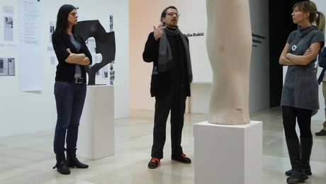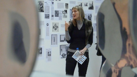 Guided tour by members of Prelom (Jelena Vesić ) of “Political Practices of (Post-) Yugoslav Art,” 2009. Exhibition view: Museum of Yugoslav History, Belgrade. Produced by Prelom in conjunction with kuda.org, Sarajevo Center for Contemporary Art (SCCA/pro.ba.), and What, How & for Whom (WHW). Photo: Vladimir Jerić Vlidi