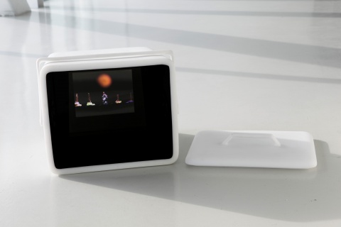 For this edition, Nathalie Djurberg and Hans Berg have, for the first time, fused Djurberg’s video and her sculpture into one object. The edition has been cast in polyurethane plastic from a Styrofoam sculpture of an ice cream box with a separate lid, handmade by the artist, and each is slightly unique. The surface of the plastic is white and slightly transparent, surreal and otherworldly. Djurberg has created a new stop-motion animation film, unique to this edition, which plays on a continual loop on a monitor imbedded inside the ice cream box, as the musical score by her collaborator Berg plays from speakers, also within the box.