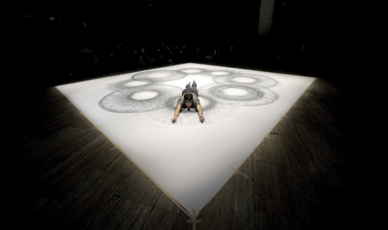 Tony Orrico is a visual artist, performer, and choreographer whose work merges the act of drawing with choreographic gesture and bio-geometrics. Evocative of the graphite wall drawings of Sol LeWitt, action painting, and Da Vinci’s “Vitruvian Man,” Orrico’s “Penwald Drawings” have been presented and exhibited internationally in galleries, performance venues, and public spaces. His work reflects upon the limitations and awe-inspiring possibilities of man as machine, where subtle “imperfections” in the final drawings reveal the intervention of human presence in an otherwise mathematically precise choreographic gesture.