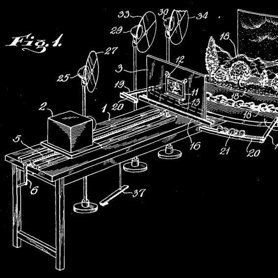 Fleischer Studios’ setback camera for producing three-dimensional effects in animation, roughly similar to Disney’s multiplane camera. From the patent by Max Fleischer, “Art making Motion Picture Cartoons.” Source: Wikimedia Commons