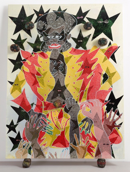 Chris Ofili, The Adoration of Captain Shit and the Legend of the Black Stars (Third Version), 1998. Oil, acrylic, polyester resin, paper collage, glitter, map pins, and elephant dung on linen, 96 × 72 in (243.8 × 182.8 cm). Courtesy Victoria Miro Gallery, London. Photo: Stephen White