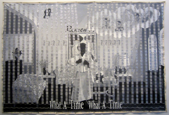 Kerry James Marshall, Memento #5, 2003. Acrylic and glitter on unstretched canvas banner, 107 5/8 × 157 1/2 in (274.3 × 396.2 cm). The Nelson-Atkins Museum of Art, Kansas City, Missouri. Purchase: acquired through the generosity of the William T. Kemper Foundation – Commerce Bank, Trustee, 2003.24.© Kerry James Marshall. Courtesy Nelson-Atkins Museum of Art, Media Services. Photo: Jamison Miller.