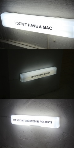 Walid Elsawi, A Contemporary Artist vs. a Con Artist, 2012. Painted text on thirteen light boxes. Courtesy Daniella Rose King