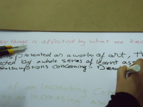 With this in mind, the artists who took part in the MASS program were each required to articulate their own artwork as well as that of others through a series of exercises. They began with short texts, before building up to longer lengths. It was essential that they remained constantly critical, and adopting different structures, they questioned the impetus that went into each object or idea’s development and production. The first exercise required that they write personal statements of each other’s work—read aloud in peer groups and dissected. The second involved the development of lengthy personalized artist statements, anchored by a discussion of concepts, form, and aesthetics, which were critiqued on an individual basis by the group. The third and most significant exercise was a formal assessment of a work of art that they had seen in the last three months. Perhaps unsurprisingly for Egypt’s second city of Alexandria, more than half of the students at the time professed to not having seen a work of art in the flesh in the three months preceding this particular exercise. Alexandria had become a city without an infrastructure, and now with the closure of the Alexandria Contemporary Art Forum (ACAF), it seems to me that the majority of participants in these kinds of programs are engaging with contemporary art through visual representations seen or experienced on the internet.